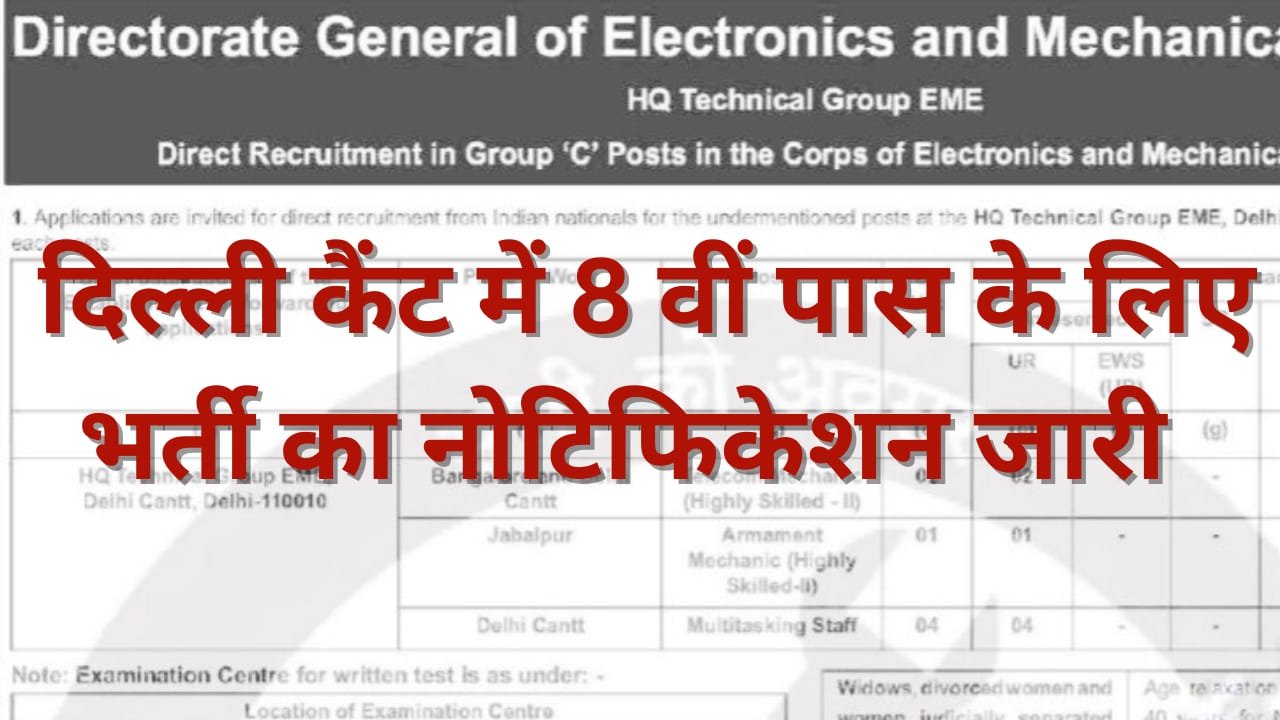 दिल्ली छावनी में निकली इस भर्ती में ऑफलाइन माध्यम से आवेदन फार्म करना होगा महिला और पुरुष दोनों उम्मीदवार आवेदन कर सकते हैं योग्यता 8 वीं से लेकर स्नातक पास तक रखी गई है जिसकी जानकारी नीचे उपलब्ध करवाई गई है तो आईए जानते हैं इस भर्ती के बारे में संपूर्ण जानकारी ताकि आपको भी इस भर्ती में आवेदन करने का मौका मिल सके l