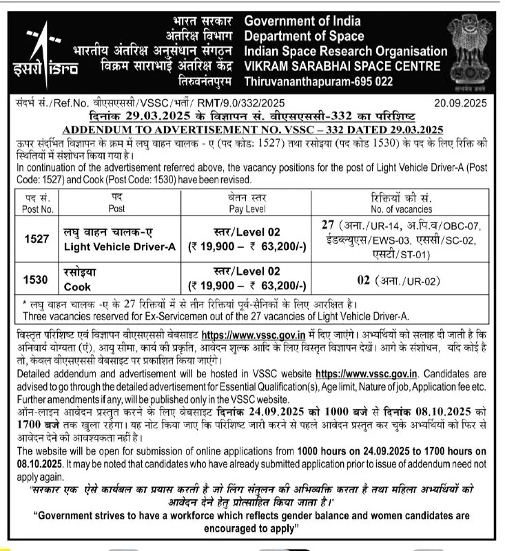 इसरो भर्ती का असिस्टेंट राजभाषा लाइट व्हीकल ड्राइवर हैवी व्हीकल ड्राइवर फायरमैन और कुक के पदों के लिए भर्ती का नोटिफिकेशन जारी कर दिया है इन पदों के लिए ऑनलाइन आवेदन फॉर्म 24 सितंबर से लेकर 8 अक्टूबर 2025 तक भरे जाएंगे इसके लिए पुरुष अभ्यर्थी संपूर्ण भारत से आवेदन फार्म कर सकते हैं।