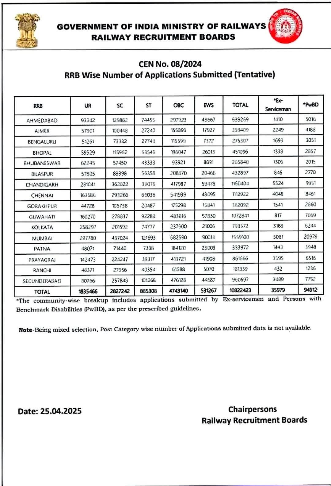 | RRB ज़ोन | अनारक्षित (UR) | अनुसूचित जाति (SC) | अनुसूचित जनजाति (ST) | अन्य पिछड़ा वर्ग (OBC) | आर्थिक रूप से कमजोर (EWS) | कुल आवेदन (TOTAL) | पूर्व सैनिक (Ex-Serviceman) | दिव्यांग (PwBD) |