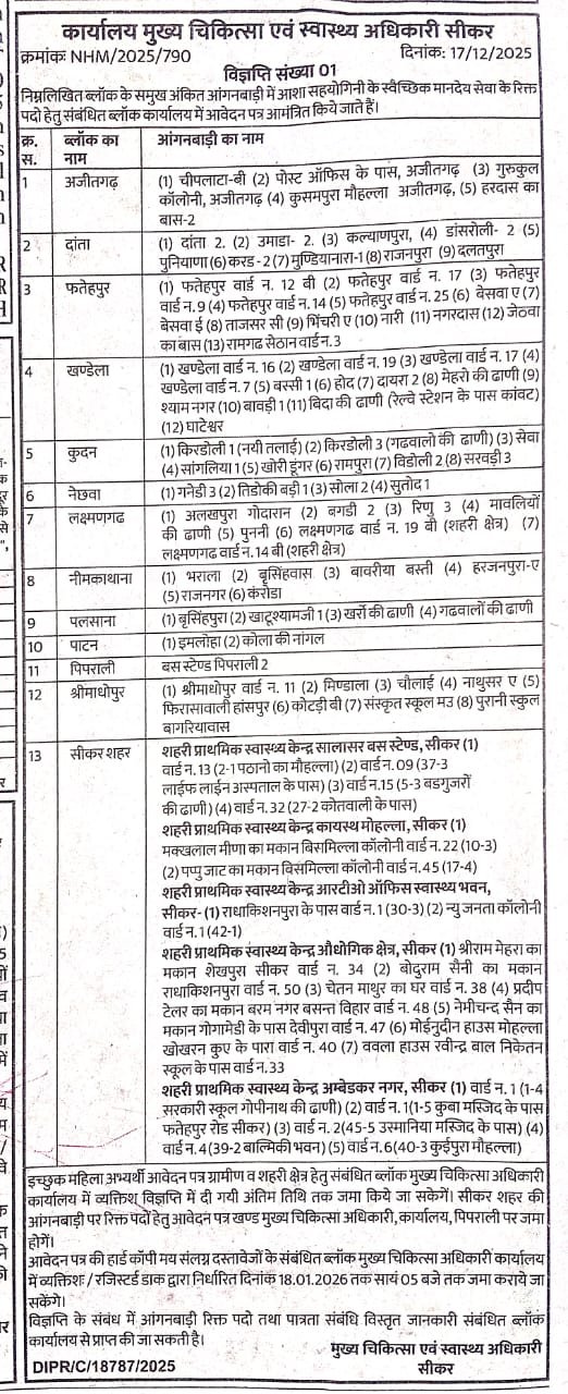 राजस्थान आंगनबाड़ी भर्ती 2026 का 10वीं और 12वीं पास महिलाओं के लिए नोटिफिकेशन जारी कर दिया गया है राजस्थान आंगनबाड़ी भर्ती के अंदर ऑफलाइन बोर्ड में आवेदन मांगे गए हैं जिसमें महिला अधिकृत आवेदन फार्म कर सकते हैं राजस्थान आंगनबाड़ी भर्ती के लिए नोटिफिकेशन जिले वाइज जारी किया जा रहा है इसमें प्रत्येक जिले के लिए अलग-अलग नोटिफिकेशन जारी हो रहा है और इसके लिए अंतिम तिथि भी अलग-अलग रखी गई है अभ्यर्थी अपने जिले के वाडिया वार्ड में उपलब्ध सीटों के अनुसार ही आवेदन फार्म कर सकता है।