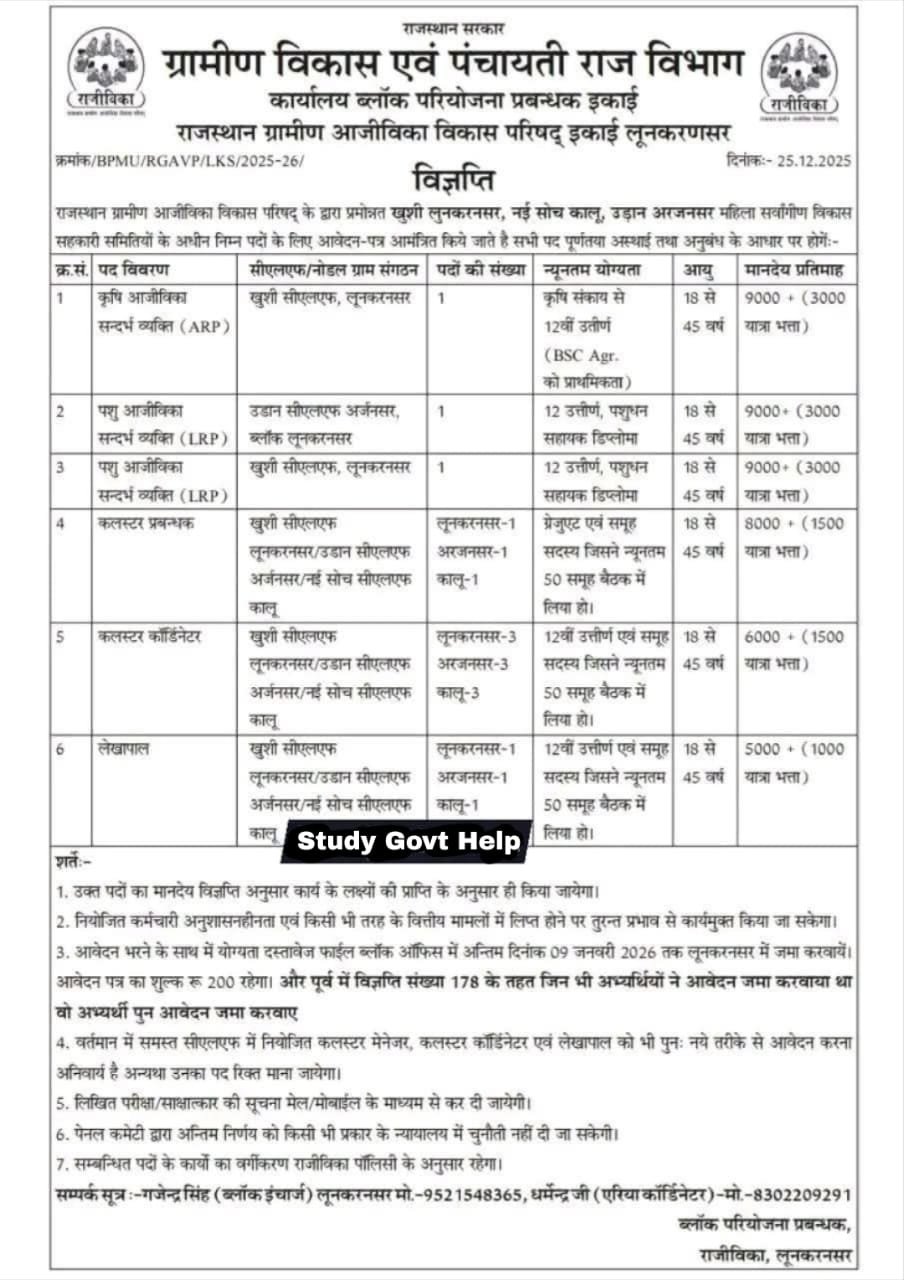 बेरोजगार युवाओं के लिए कृषि आजीविका संदर्भ व्यक्ति, पशु आजीवका संदर्भ व्यक्ति, क्लस्टर प्रबंधक ,कलस्टर कोऑर्डिनेटर और लेखपाल के पदों पर भर्ती के लिए नोटिफिकेशन जारी हुआ है जिसके लिए आवेदन ऑफ़लाइन माध्यम से मांगे गए हैं और 9 जनवरी 2026 अंतिम तिथि रखी गई है l