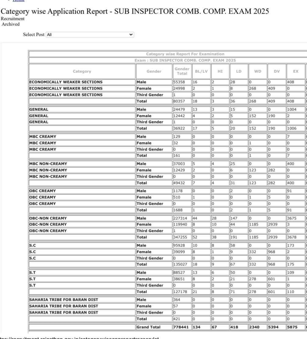 सबसे पहले हम आपको बता दें कि आरपीएससी एसआई के अंदर टोटल फॉर्म की संख्या 7,78,441 है जिसमें सबसे ज्यादा अन्य पिछड़ा वर्ग नॉन क्रीमी लेयर श्रेणी के अंदर आवेदन फार्म भरे गए हैं इसकी संख्या 142755 है और सबसे कम एमबीसी वर्ग में क्रिमिनल श्रेणी के अंदर है जिसमें सिर्फ 161 आवेदन फॉर्म आए हैं।